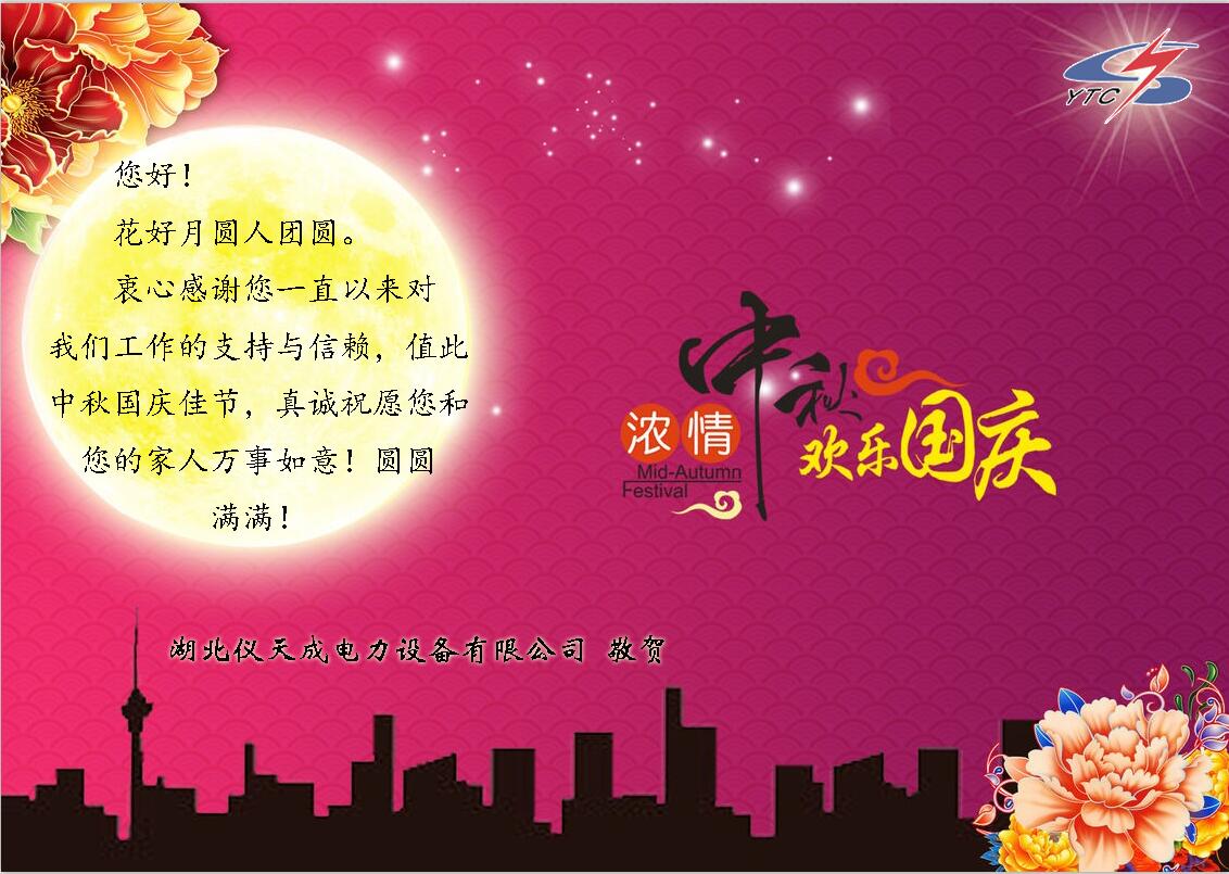 在這舉國歡慶的時(shí)刻,湖北儀天成電力設(shè)備有限公司衷心的祝愿祝所有的員工,所有的新老客戶,國慶節(jié)以及中秋節(jié)快樂!