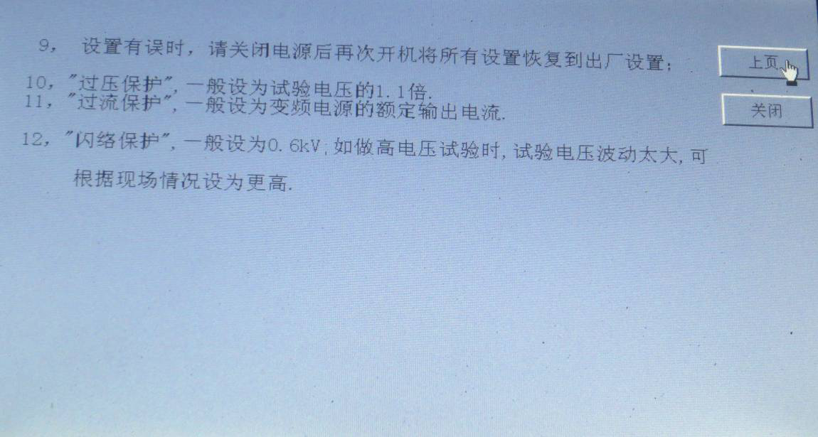 閃絡(luò)保護:設(shè)置擊穿電壓的誤差值,且當閃絡(luò)后液晶顯示屏須重新啟動