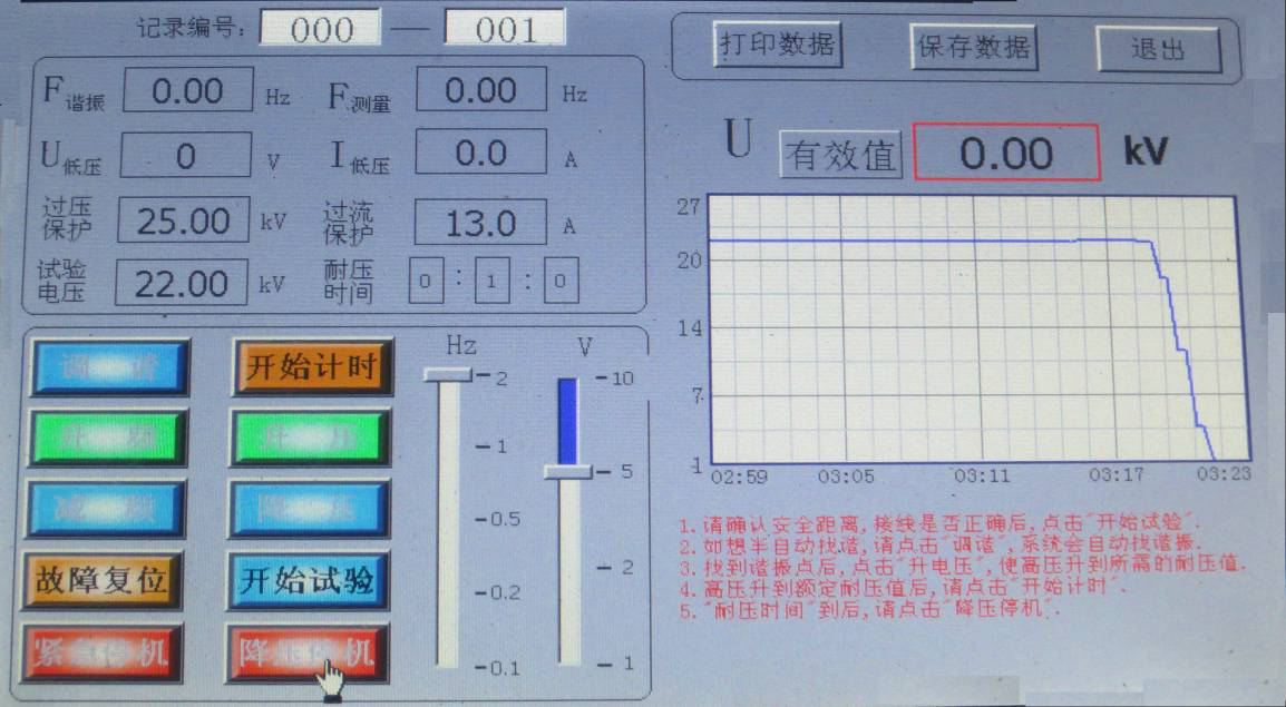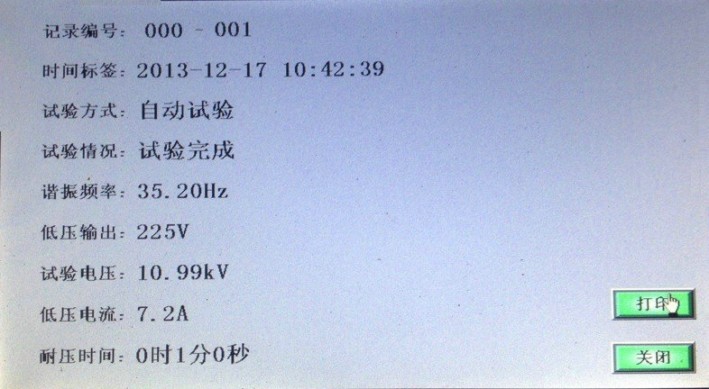 當U諧振電壓降壓0時,試驗完成,如想查詢試驗記錄,請在降壓前點擊保存數(shù)據(jù),降壓后點擊“文件管理”; 顯示界面如圖所示。