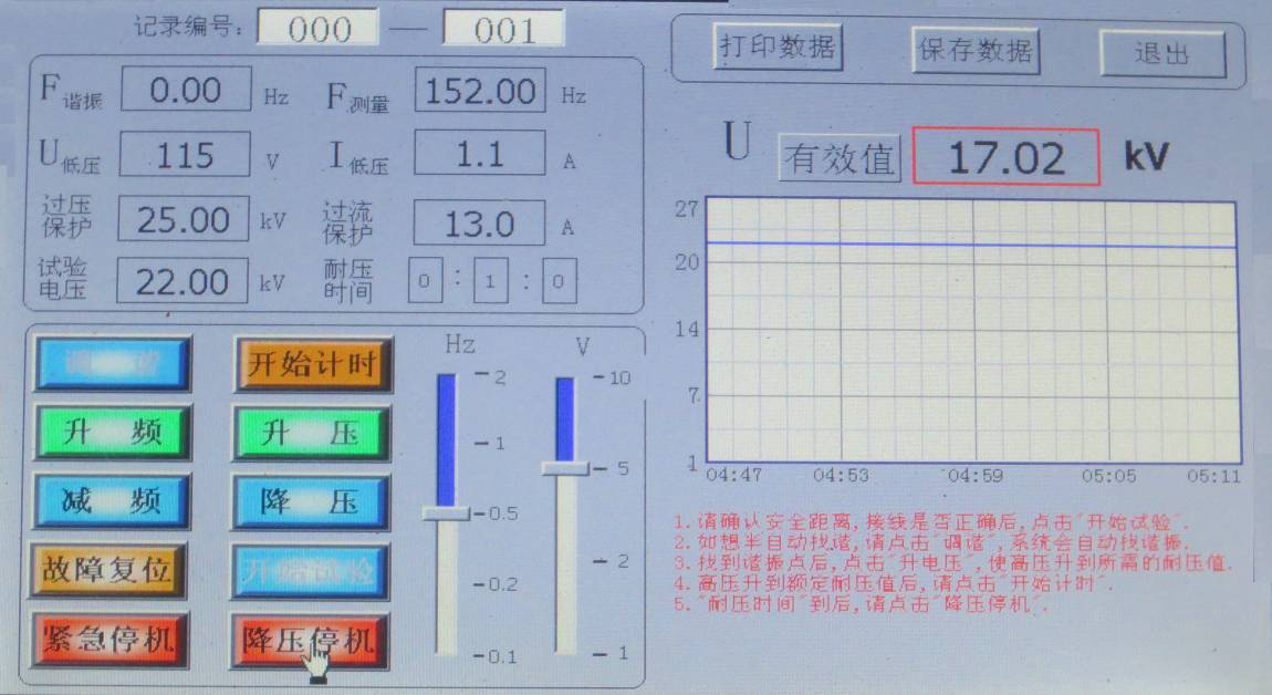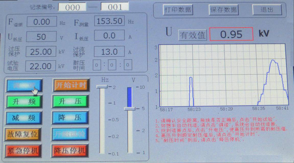 如不想自動找諧振點,先點擊“升電壓”,將“U低壓”升到50V,再點擊“升頻率”來找諧振點,找到諧振點后,點擊“升電壓”, 顯示界面如圖所示。