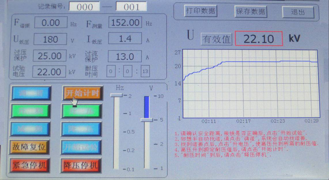 當U諧振電壓升到設(shè)置時的耐壓值,點擊“耐壓計時”,系統(tǒng)開始計時。顯示界面如圖所示。