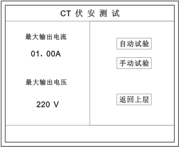 在主菜單界面,旋轉(zhuǎn)鼠標將光標移動到 CT測試 選項上,按下旋轉(zhuǎn)鼠標選擇 CT伏安 即可進入伏安特性試驗設(shè)置界面(如右圖)。光標移動至 返回上層 ,按下鼠標即可返回主菜單。