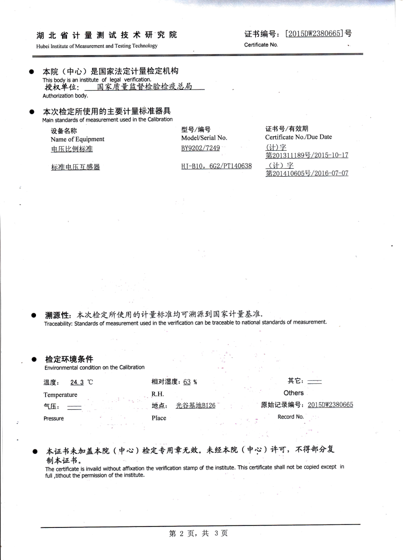 | 試驗電壓 | 一次繞組感壓耐壓為1.2 Un,1分鐘,二次繞組對地,工頻耐壓2KV,1分鐘 |