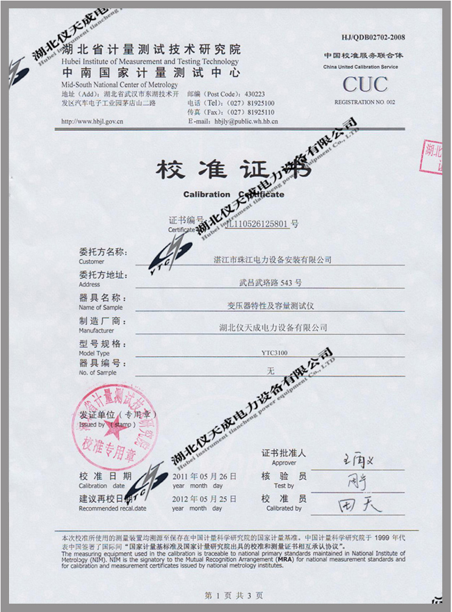 YTC3100變壓器容量及損耗參數(shù)測試儀鑒定證書