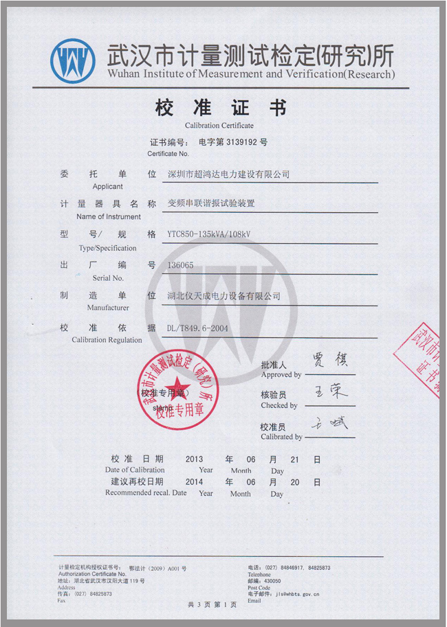 轉(zhuǎn)載:"YTC850系列電纜交流耐壓試驗(yàn)裝置鑒定證書(shū)" 請(qǐng)注明來(lái)源于儀天成電力。 更多技術(shù)問(wèn)題請(qǐng)致電儀天成電力客戶服務(wù):027-87876585,技術(shù)部專線:027-87876585,在線客服: